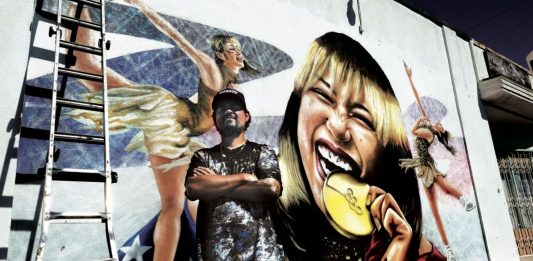 Street artist and muralist Gustavo Zermeno Jr. stands before his near-finished mural of double-gold medalist, skater Alysa Liu, on Sunday in Gardena....