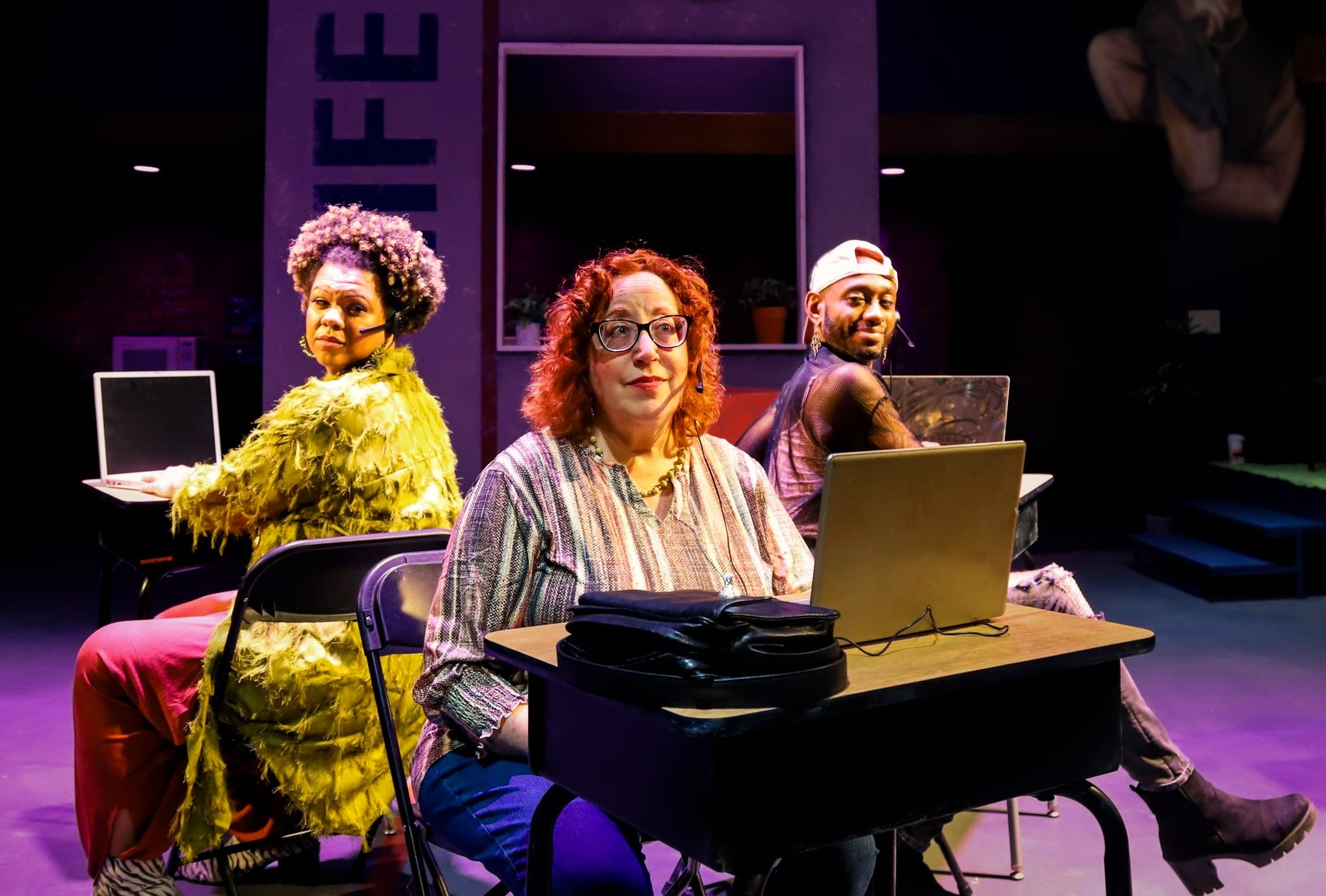Featured in the super talented cast are Brittany Visser as Jen, one of the trainers who bonds emotionally with Patti (Amy Tolsky) after she finds out what an important part Jen played in her son’s final hour. Tommy Dickie portrays Drew, an HIV-positive trainer, who works with others to realize how important pronouns can be when speaking with callers who cannot accept being ostracized for being who they really are. The other trainers are Clifton J. Adams as Kai who accepts himself as he knows he is and encourages others to do the same. Naomi Rubin is Sarah Beth, a self-acknowledging trans who recently got engaged to another trans person whom we never meet. And curly-haired Xoë Sazzle as Maya, who identifies as a loud and proud queer. At alternating performances, the cast is accompanied by musicians Joh Chase or Lou Roy on guitar whose original song soothes the soul after many emotionally draining sequences. Kudos to director Sawyer for adding in this character to enhance the emotional impact of the story.
