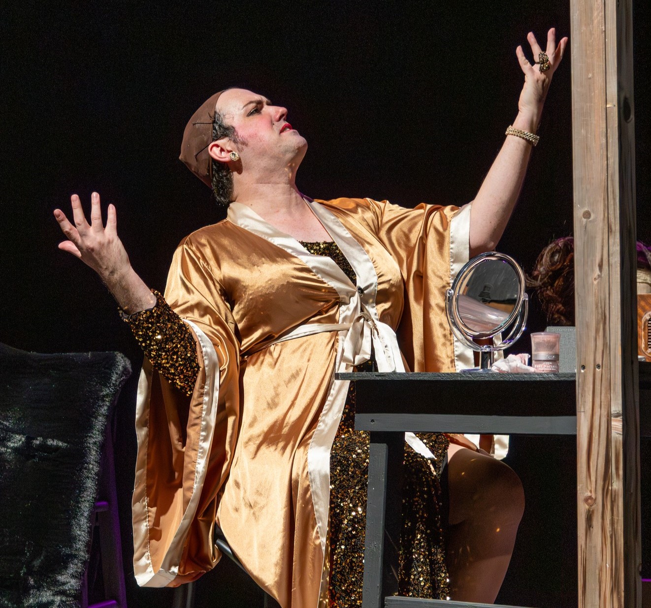 Last week I shared information about Harvey Fierstein’s Torch Song at the Morgan-Wixson through October 12. Since I have now seen the production, I encourage everyone to attend to experience Michael Mullen’s tour-de-force performance as Arnold Beckoff, a talented drag queen named Virginia Ham, who attempts to find true love in his real life. Written by Harvey Fierstein, we follow Arnold as he falls in love with Ed (Harrison Smith), a bisexual man who leaves him to marry a woman, to dating Alan (Stephen Gregg), a handsome and much-younger male model who suffers a tragic end. Soon after, Arnold must deal with his visiting mother (Paige Morrow Kimball) who begs him to date a woman and make her a grandmother.