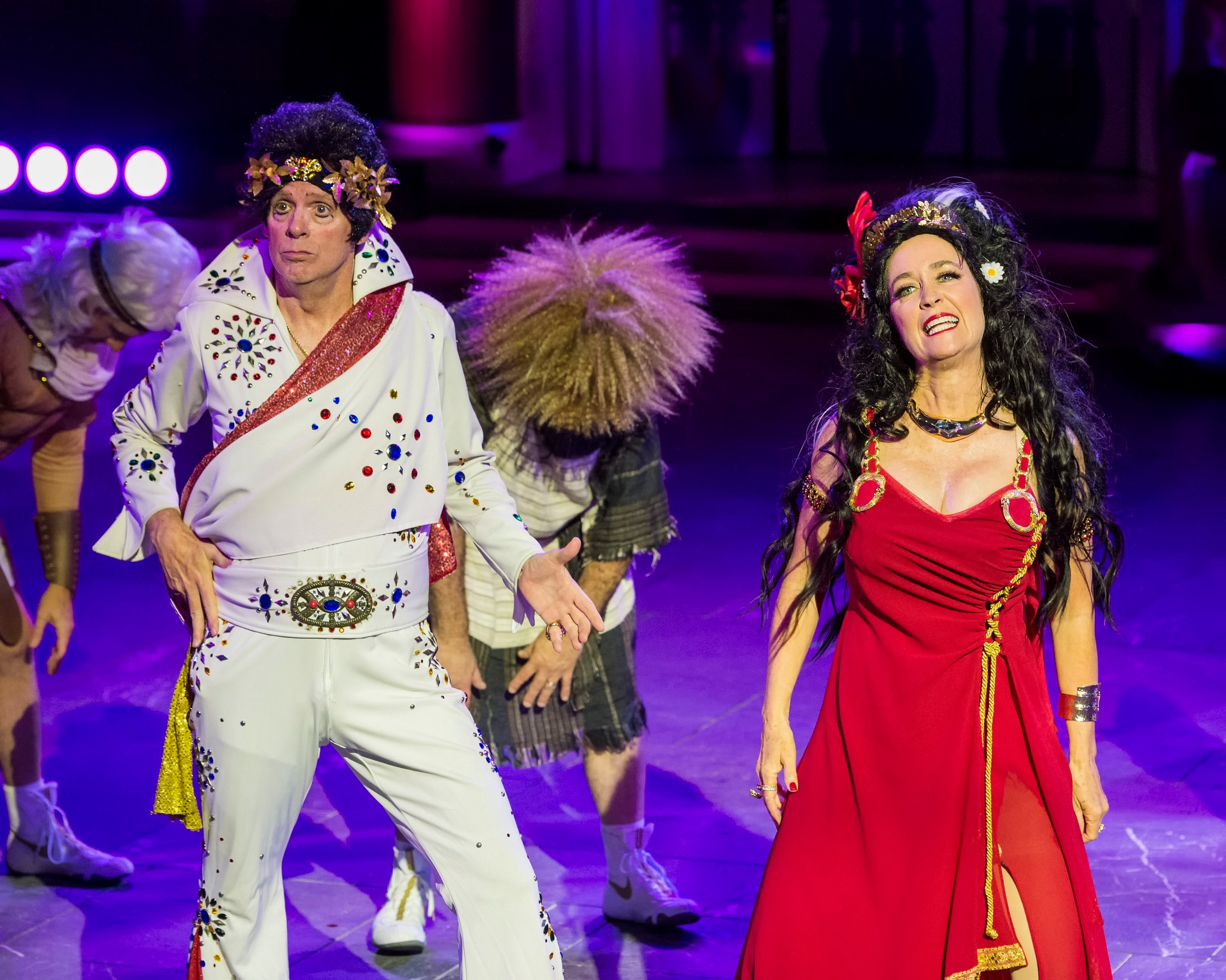 Adapted and directed by Matt Walker, the artistic director of the Troubies, who brilliantly swaggers his way across the stage as Oedipus in a white jumpsuit and big hair, the cast includes Beth Kennedy as Jocasta (“a big-haired woman in love with a man in a toga”); Rick Batalla as Creon (mispronounced by Oedipus as “Crayon”); Mike Sulprizio as long-haired seer Teiresias; Steven Booth as Young Oedipus who sings up a storm as Elvis both with and without Matt Walker as adult Oedipus; soulful belter Cloie Taylor as the Shepherd; Suzanne Jolie Narbonne as Ismene/Chorus; Lara Lafferty as Antigone/Chorus; Philip McNiven as Messenger; and Katie Malia as Sphinx attendant.