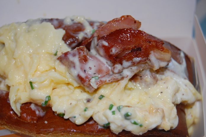 There’s a generous scoop of scrambled egg on there, which is cooked beautifully. It’s light and fluffy, and it pairs magnificently with the bread. The combination of the egg sauce and sriracha aioli blend and add so much flavor, and the chives lend some much-needed bite. The bacon and cheese finish the whole thing off. It really is a great breakfast sandwich, and very different to its American counterpart.